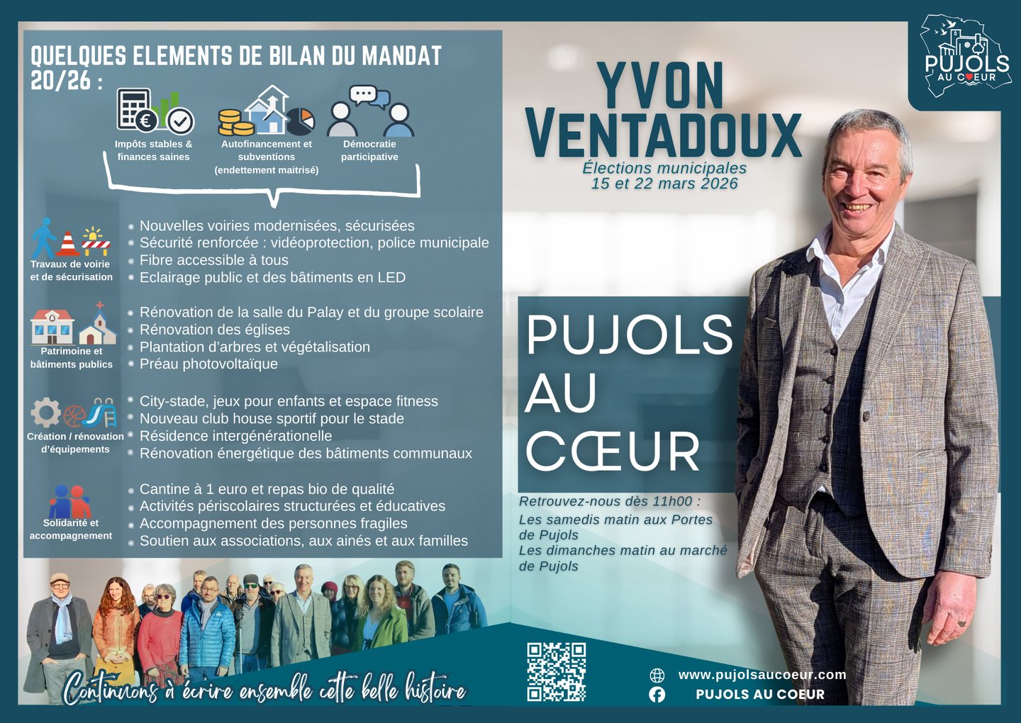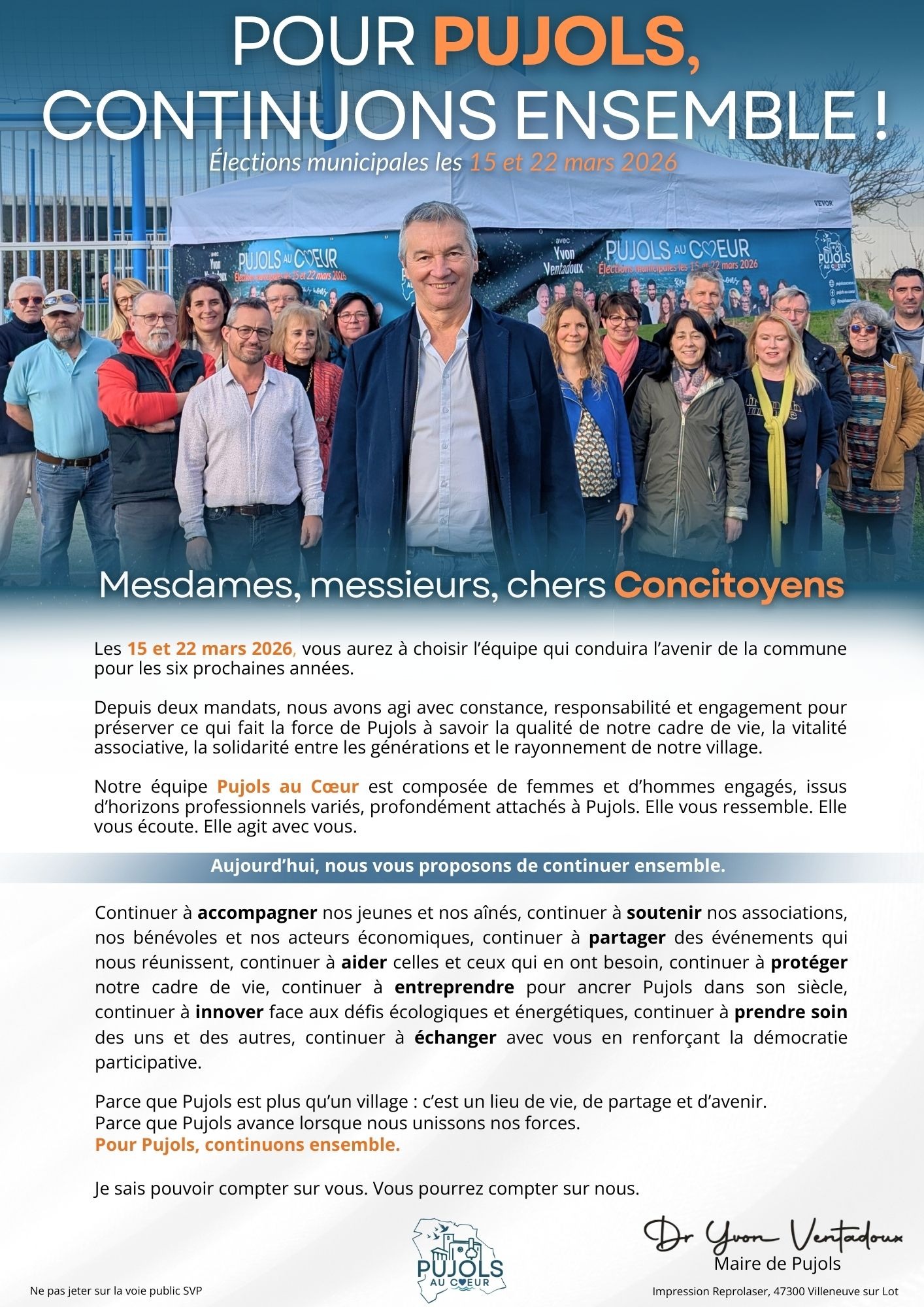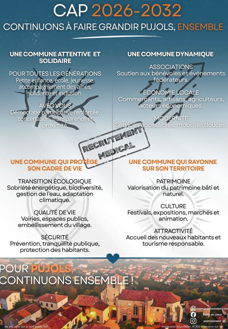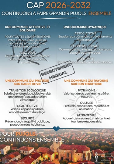 Pour Pujols, continuons ensemble ! Elections municipales les 15 et 22 mars 2026.