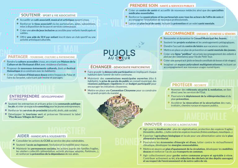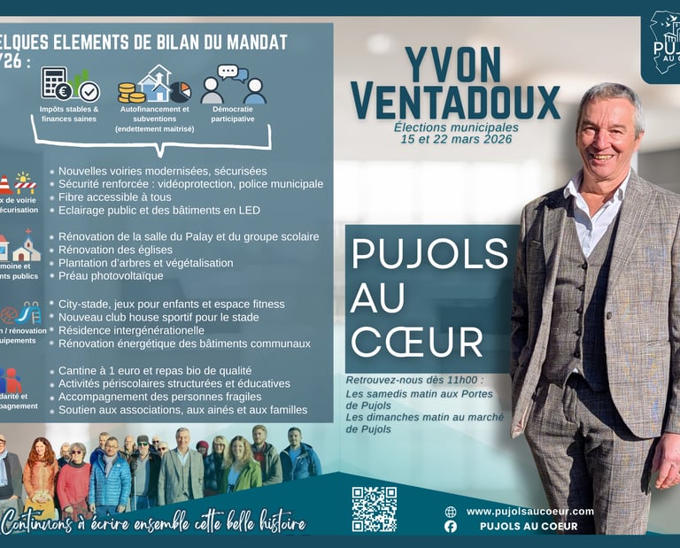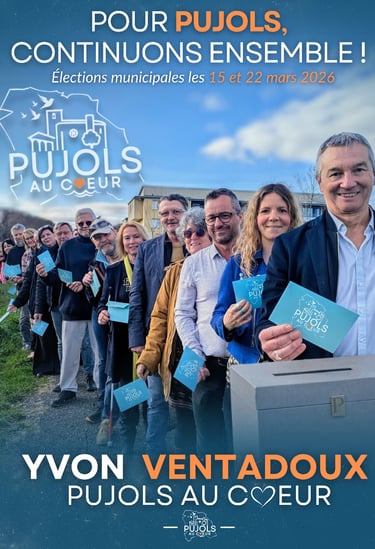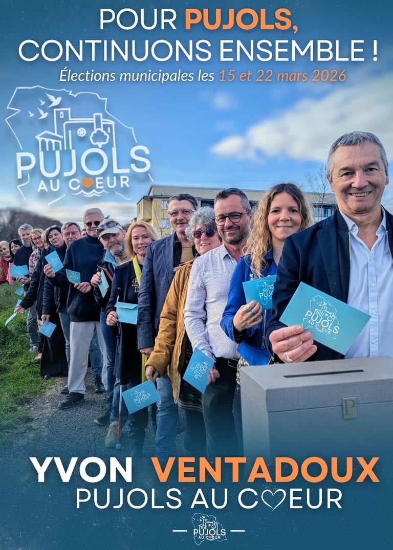 Les 15 et 22 mars 2026, vous aurez à choisir l’équipe qui conduira l’avenir de la commune pour les six prochaines années. Depuis deux mandats, nous avons agi avec constance, responsabilité et engagement pour préserver ce qui fait la force de Pujols à savoir la qualité de notre cadre de vie, la vitalité associative, la solidarité entre les générations et le rayonnement de notre village. Notre équipe Pujols au Coeur est composée de femmes et d’hommes engagés, issus d’horizons professionnels variés, profondément attachés à Pujols. Elle vous ressemble. Elle vous écoute. Elle agit avec vous.